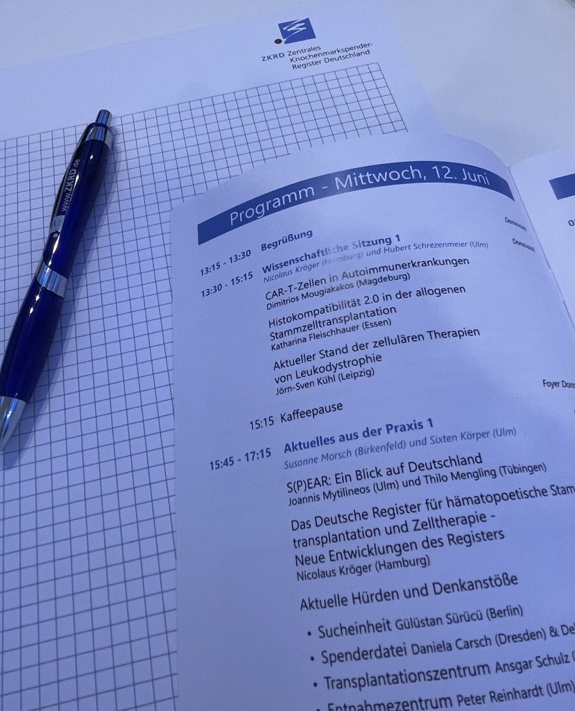 Es hieß raus aus meiner Übersetzerinnen-Komfortzone, denn auf der Tagung des Zentralen Knochenmarkspender-Registers Deutschland (ZKRD) in Ulm kannte ich keine Menschenseele. Dort, in der Donauhalle, tauschten sich sämtliche Interessengruppen aus dem Bereich der 𝗦𝘁𝗮𝗺𝗺𝘇𝗲𝗹𝗹𝘁𝗿𝗮𝗻𝘀𝗽𝗹𝗮𝗻𝘁𝗮𝘁𝗶𝗼𝗻 aus: zahlreiche Organisationen, die Spender:innen rekrutieren („Spenderdateien“), Transplantationszentren, Einrichtungen, die für die Suche nach zum Patienten bzw. zur Patientin passenden Spender:innen zuständig sind („Sucheinheiten“), Kuriere, die das wertvolle Gut zum Transplantationsort befördern, das Team vom ZKRD und viele weitere.
